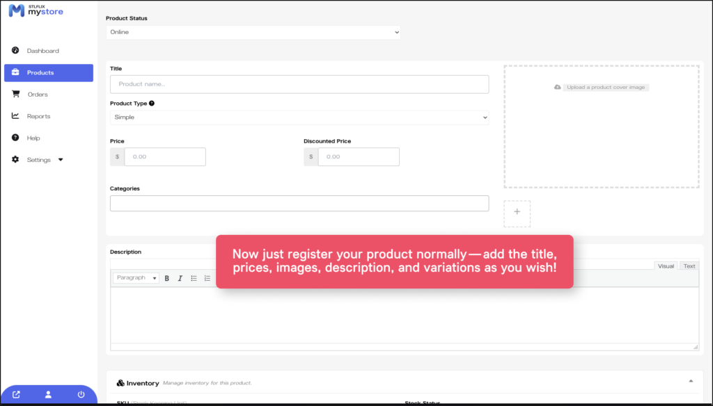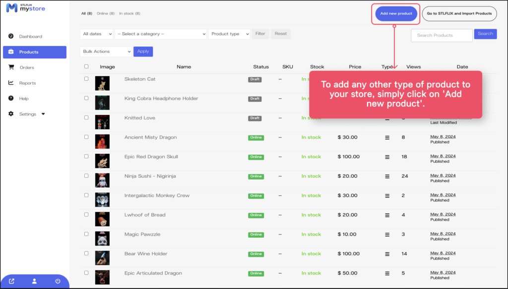 1. In addition to STLFLIX models, you can add any other product to your store. To do this, first go to the left panel, click on “Products,” and then click on “Add New Product.”