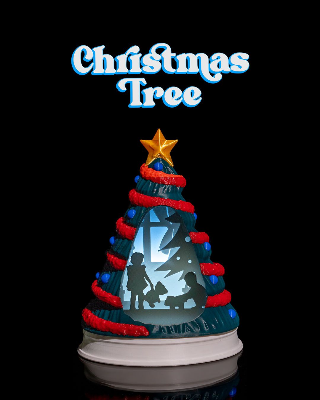 The image shows a decorative Christmas tree ornament with a star on top. The tree is adorned with red garlands and blue ornaments. Inside the tree, there’s a cutout scene depicting two children, one standing and holding a teddy bear, and the other sitting. The background of the cutout scene includes a silhouette of a larger Christmas tree. Above the ornament, the text “Christmas Tree” is written in a stylized, festive font.