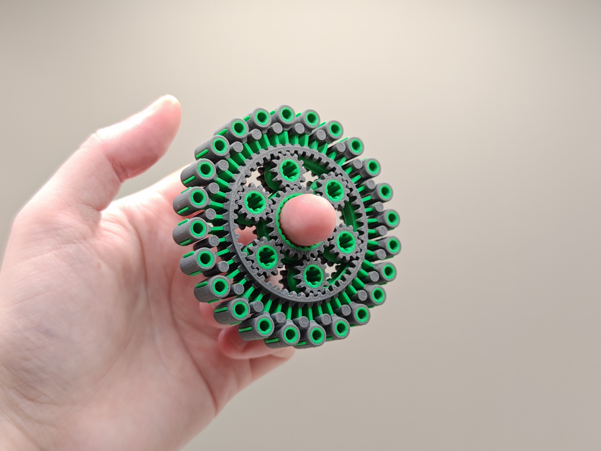 Uma engrenagem planetária de alta resistência em formato de spinner antiestresse. Conta com  6 engrenagens circulares.