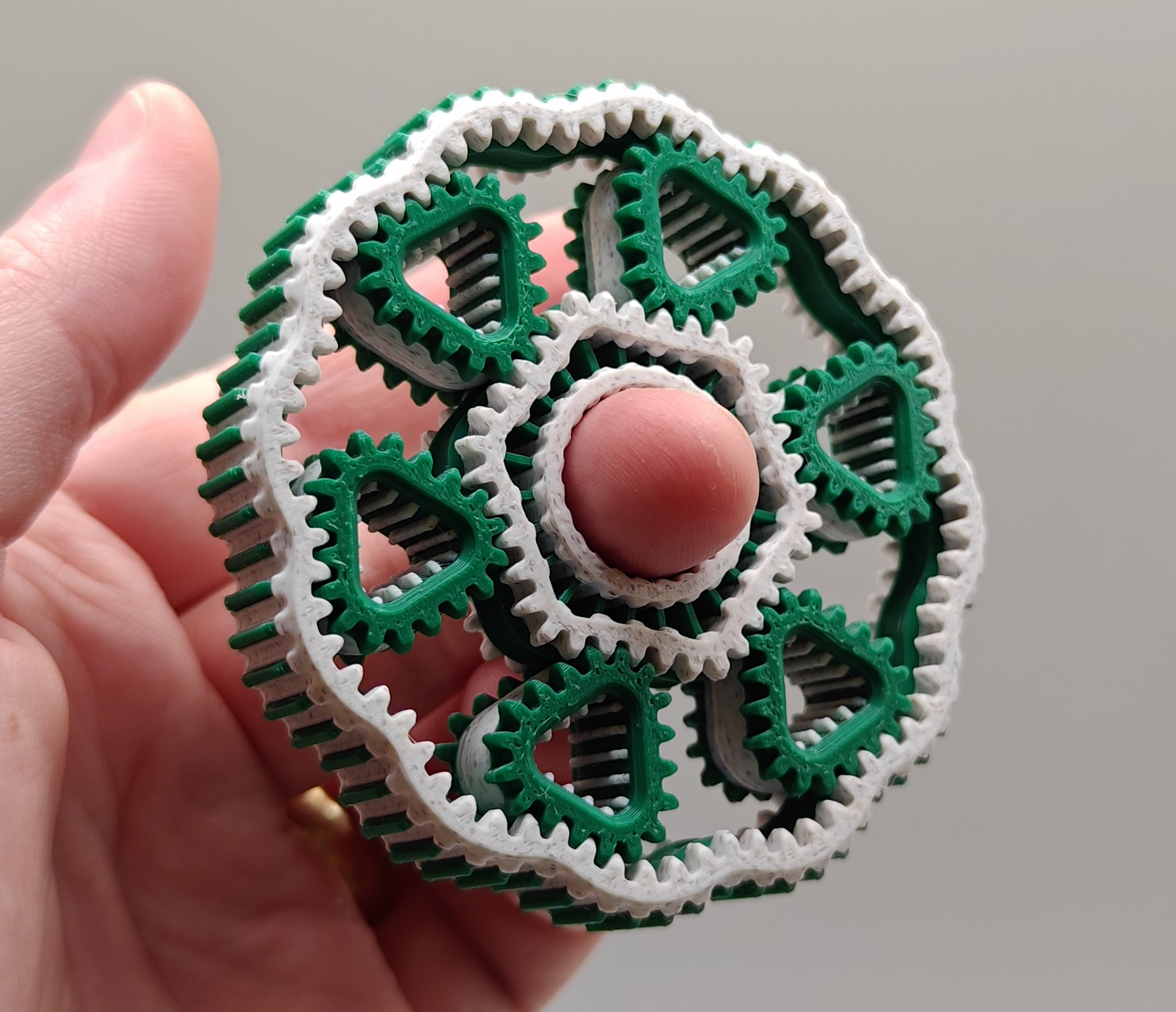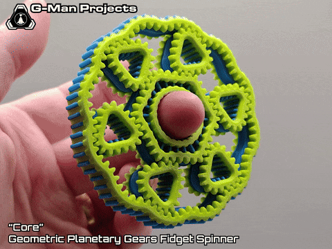 Uma engrenagem planetária geométrica em formato de spinner antiestresse. Conta com  6 engrenagens em formato de triângulo.