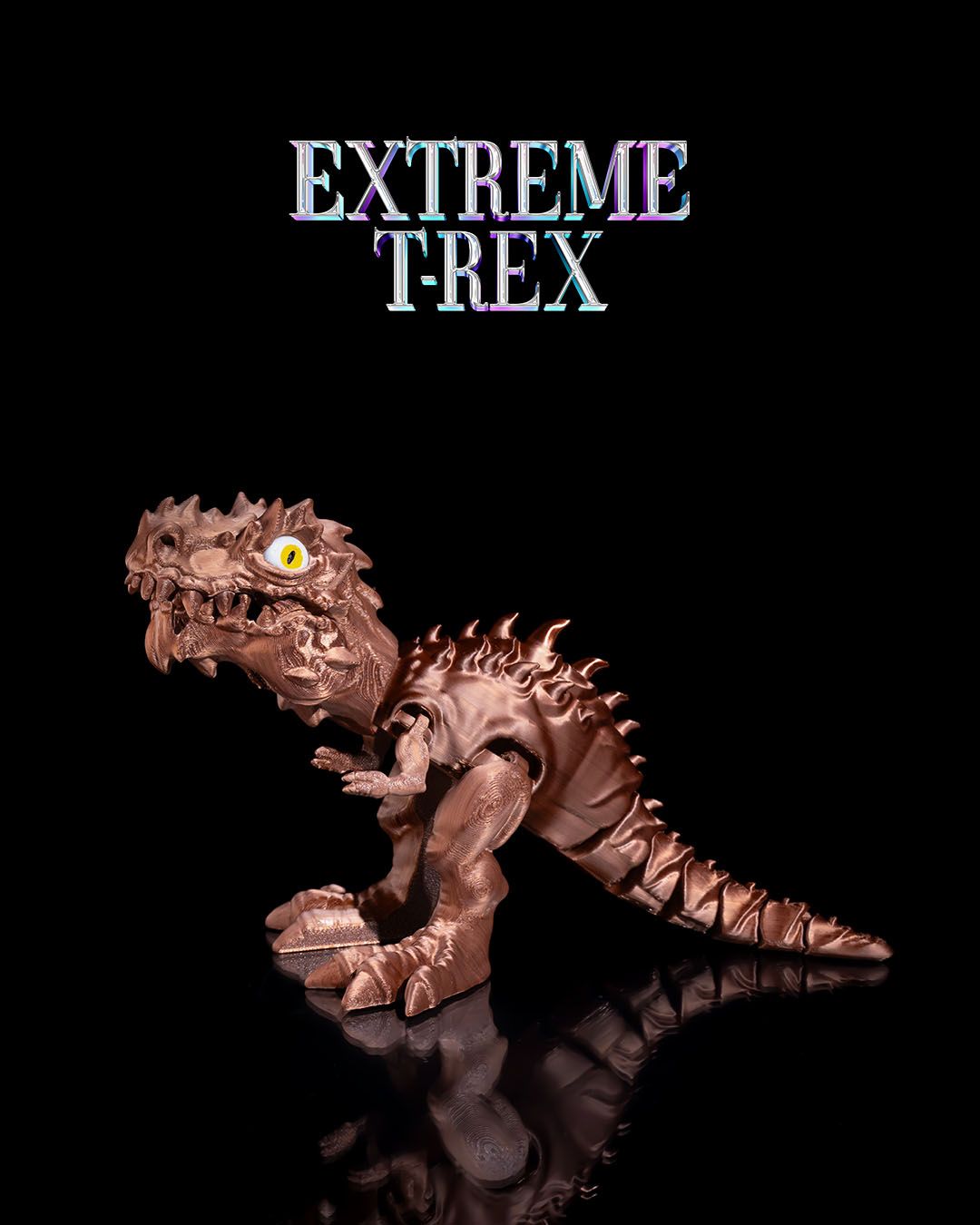 Articulating t-rex printed out of one color with hand painted eyes.