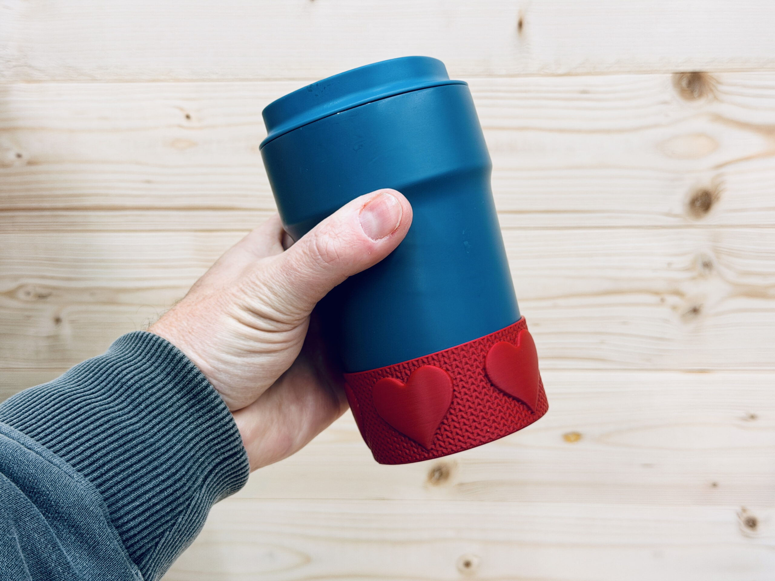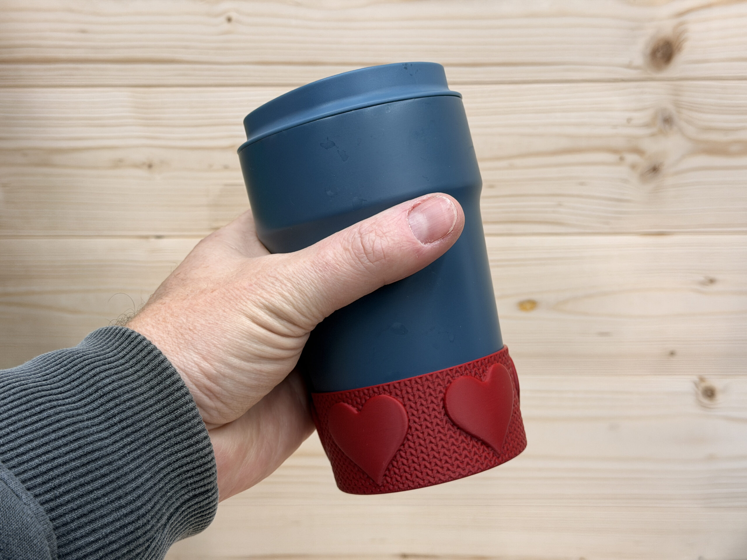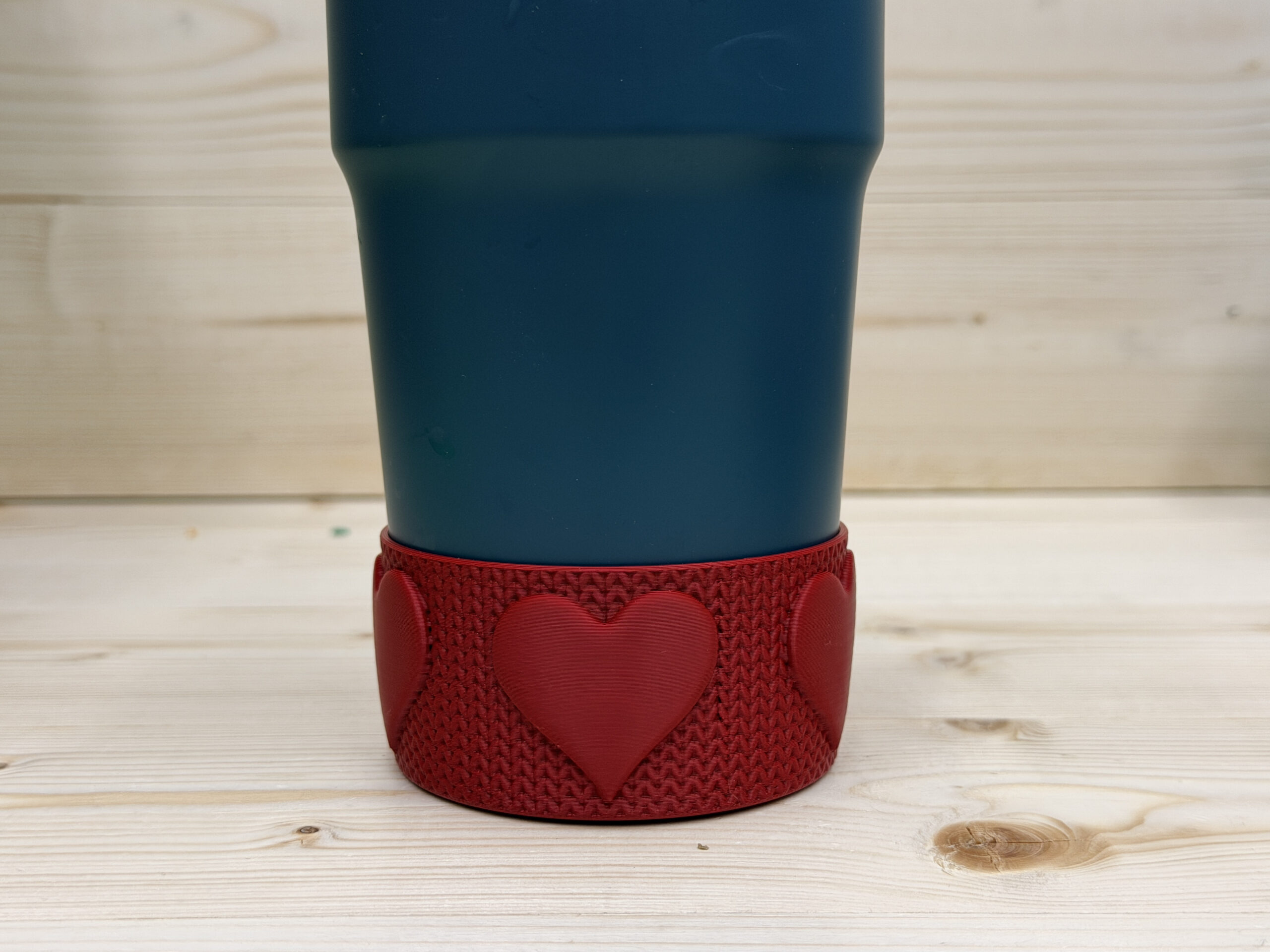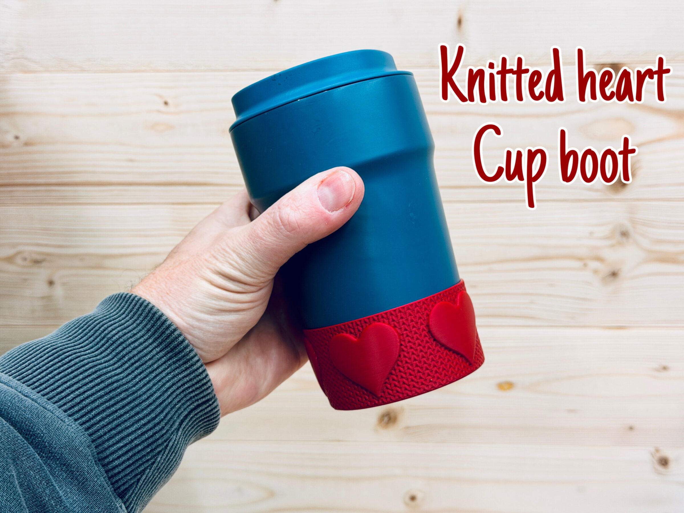 A simple Knitted heart cup boot, fits a standard coffee cup inc stanley cups