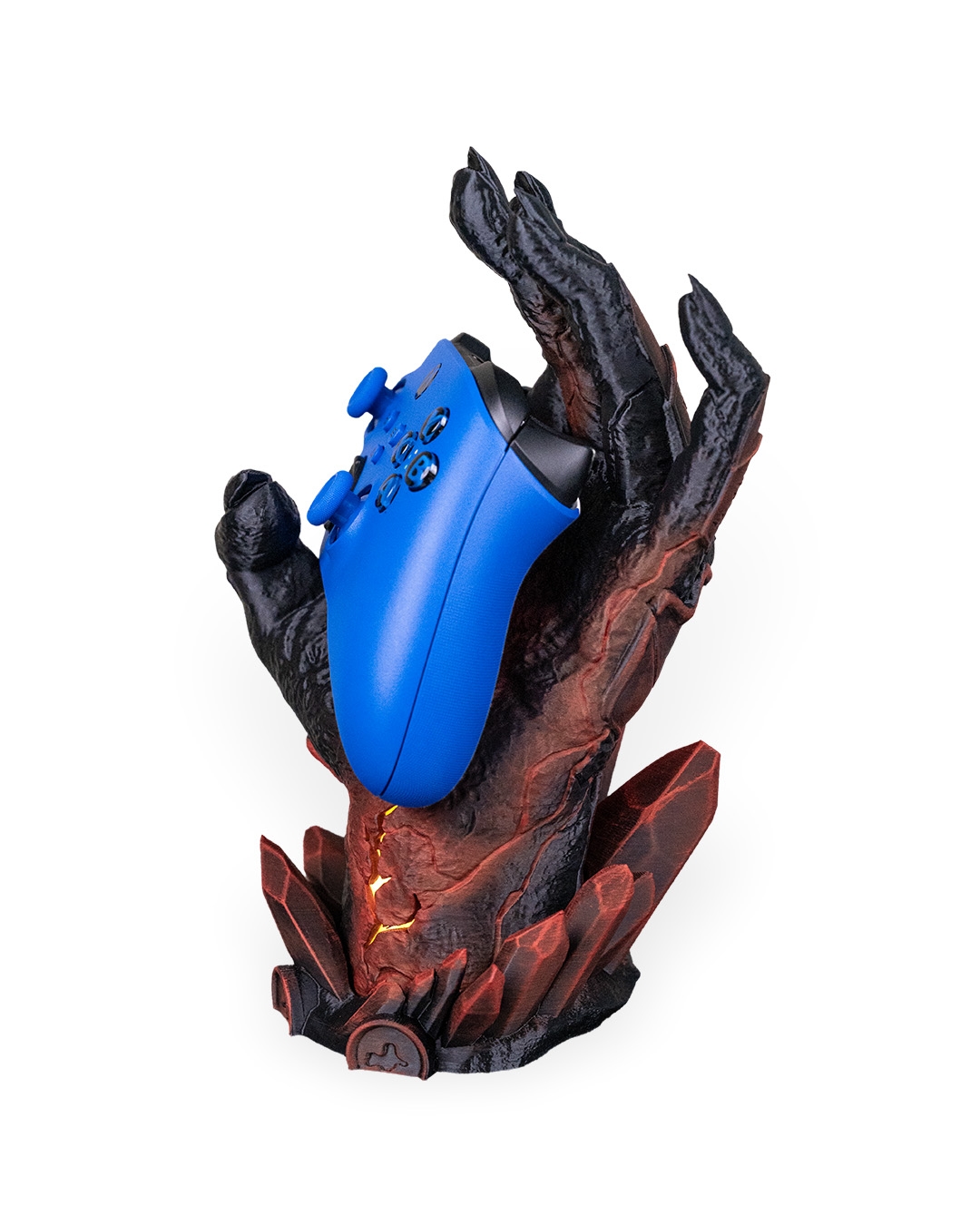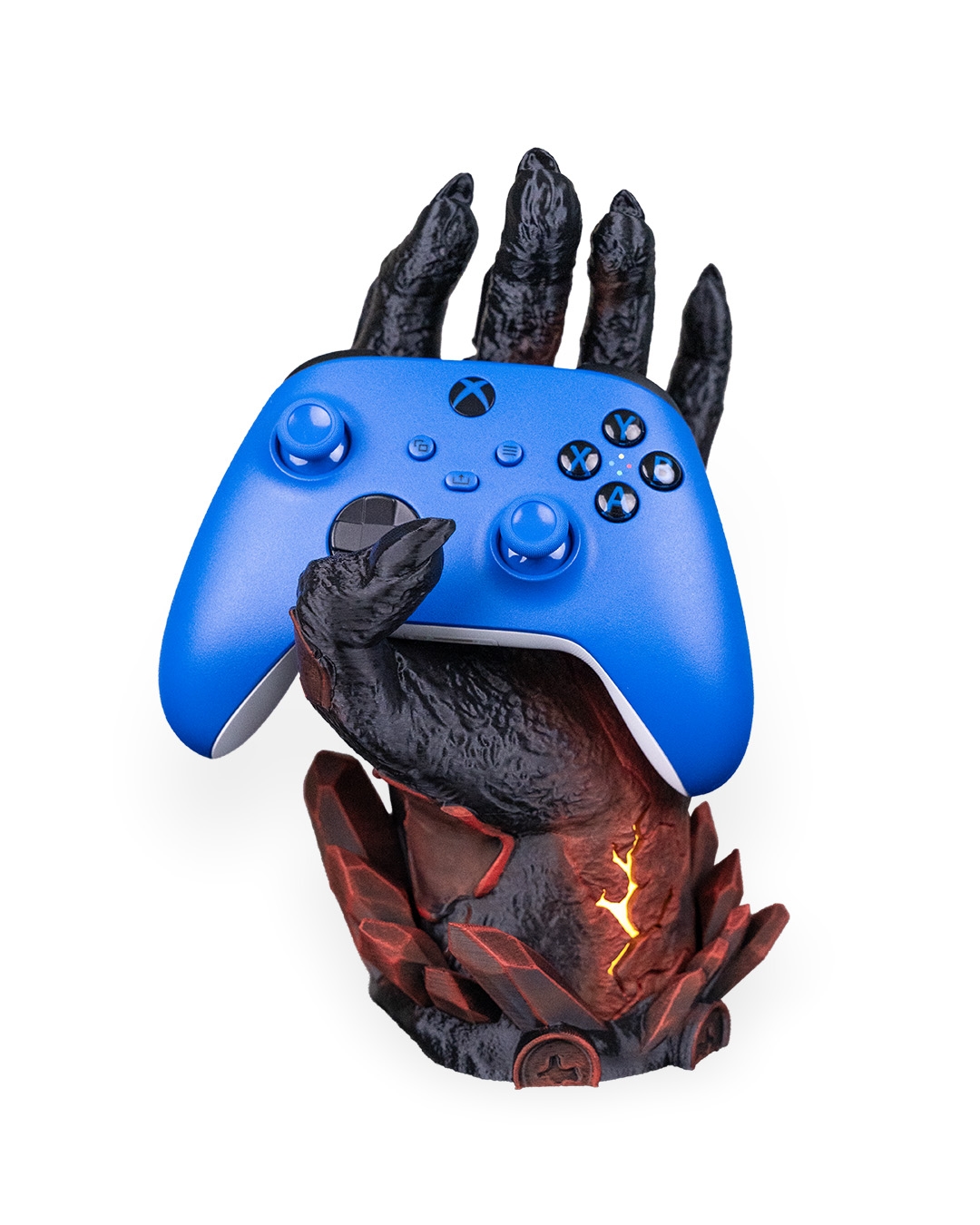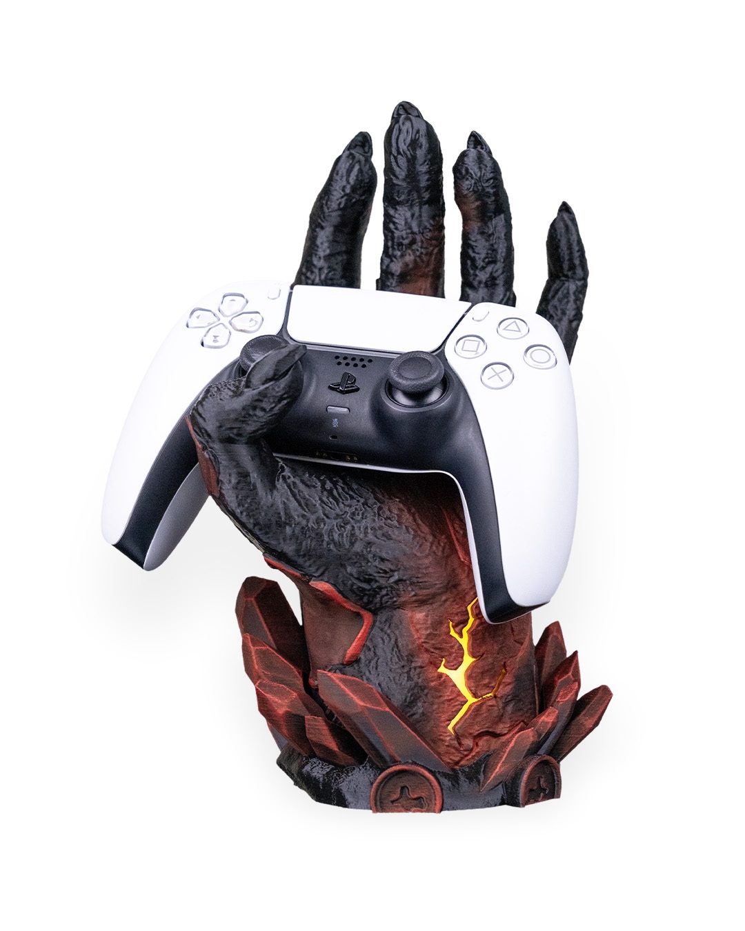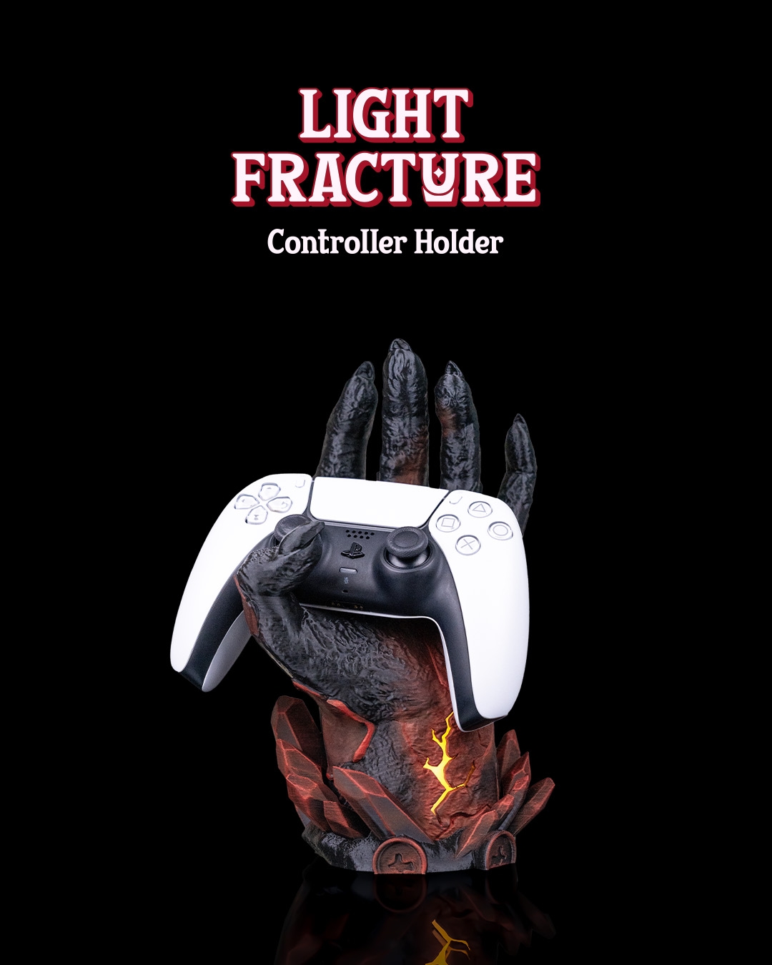 Dark, dramatic, and still better at holding it together than you. Introducing Light Fracture, a gaming controller holder that has been 3D printed & hand painted. It also features a battery operated tea-light (included) in the base to add a subtle glow to the crack positioned on the wrist.
