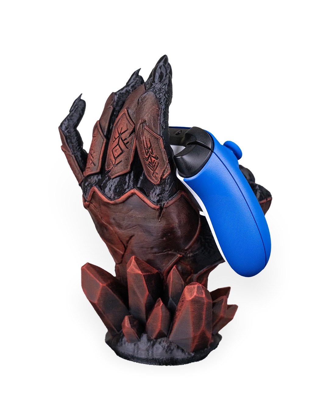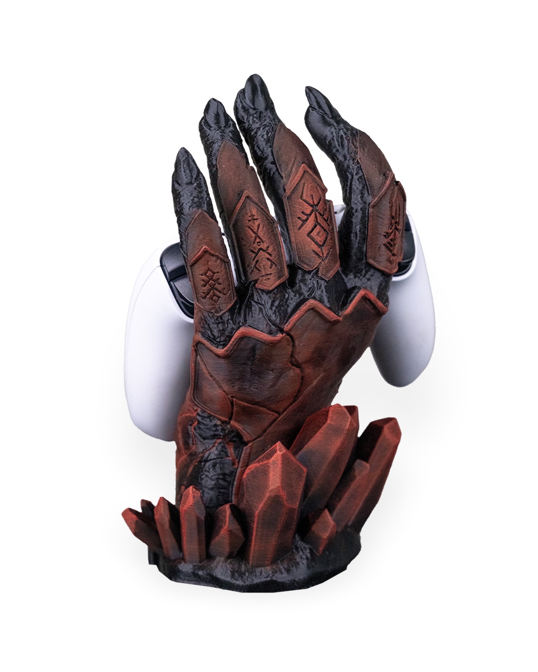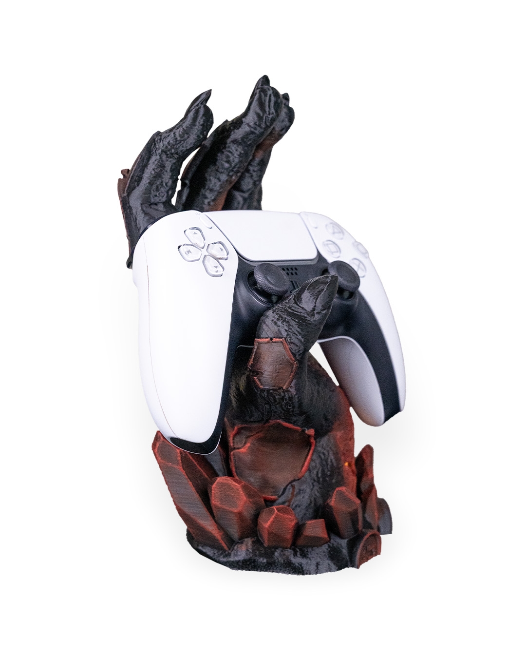 Dark, dramatic, and still better at holding it together than you. Introducing Light Fracture, a gaming controller holder that has been 3D printed & hand painted. It also features a battery operated tea-light (included) in the base to add a subtle glow to the crack positioned on the wrist.