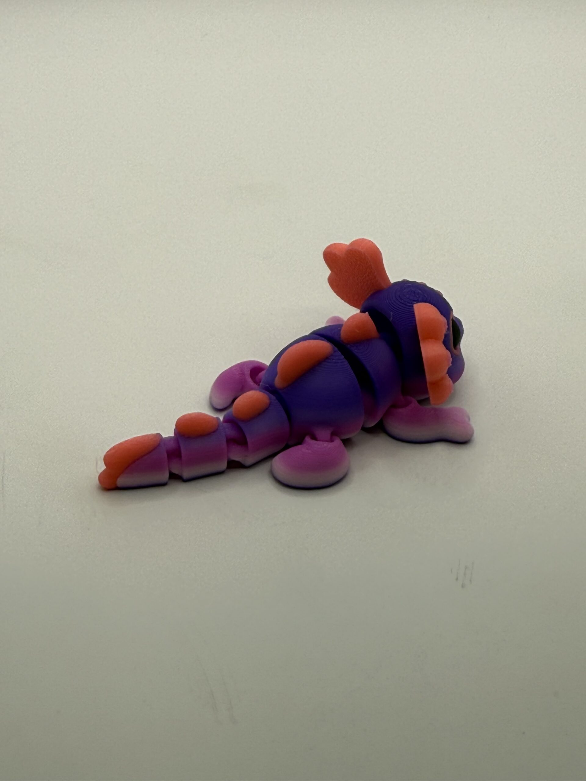 Mini Axolotl with unknown designer. This is printed with a filament that changes color as it prints, so slight variations in your colors are possible.