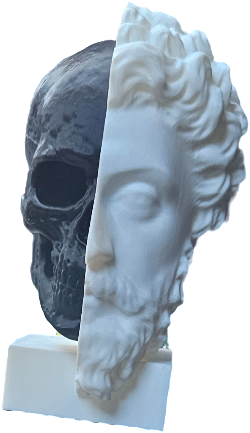 A bust titled momento mori, contrasting stoicism and morality.