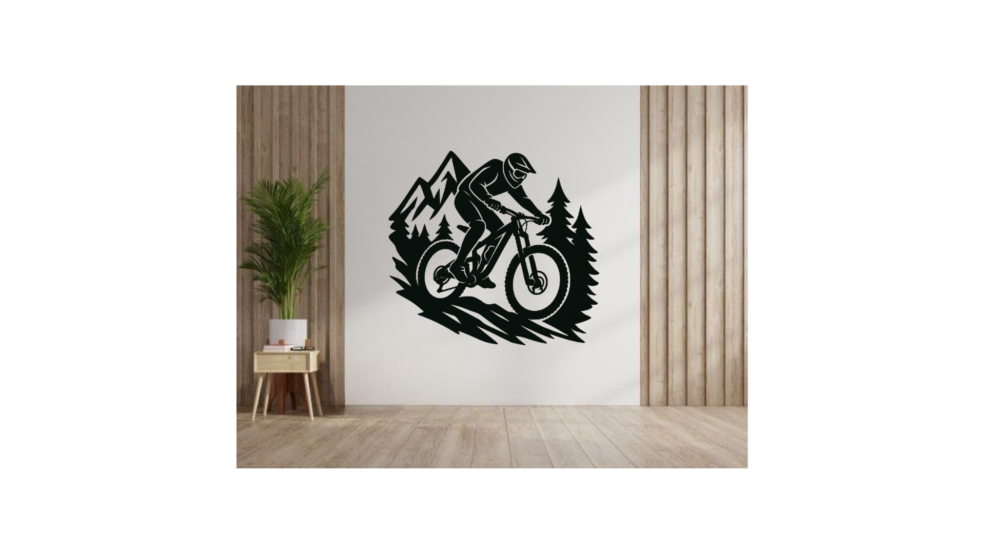 Capture the adrenaline of the ride with this bold wall decoration featuring a mountain biker tackling a forest trail. With dynamic lines, rugged scenery, and a full-suspension bike in action, this design is perfect for cyclists, outdoor enthusiasts, or as standout décor for garages, workshops, or sport-themed interiors.