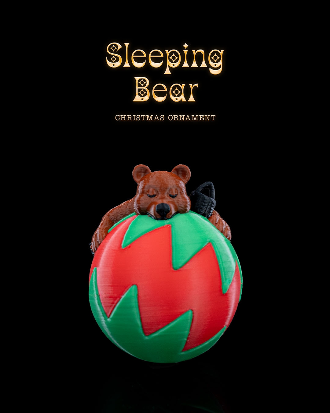 A Christmas ornament designed to look like a sleeping bear on top of a large, red bauble decorated with green zig-zag patterns. The bear is depicted in a relaxed, sleeping position with its head resting on the bauble.