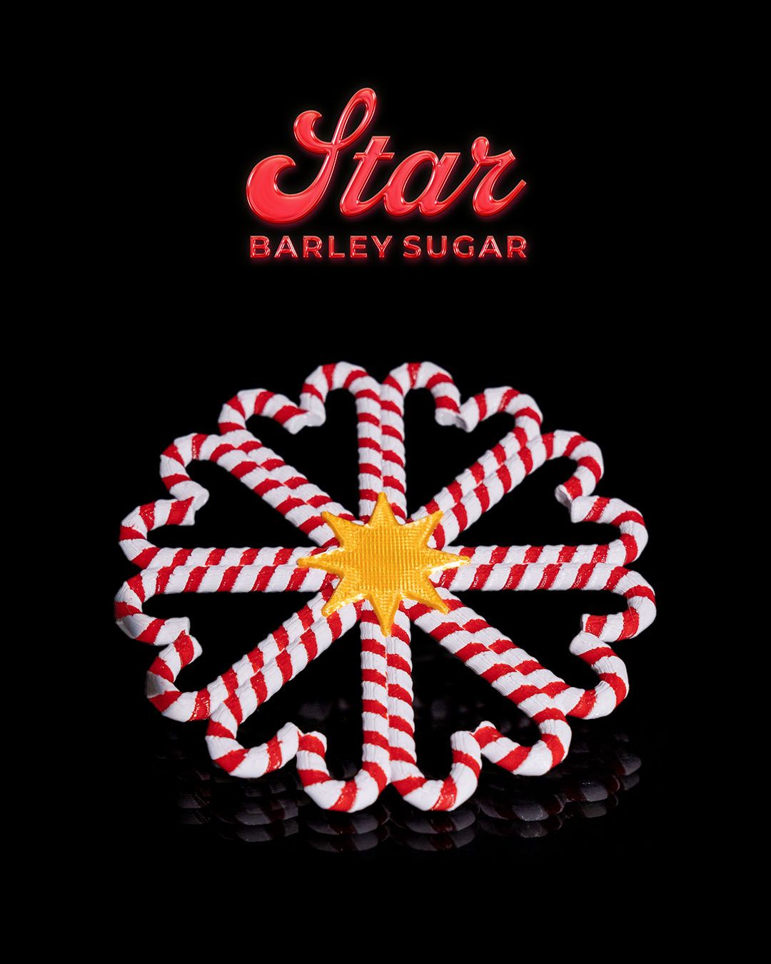The image shows a decorative object that resembles a star made from twisted red and white striped material, likely candy or a candy-like material. The star has a yellow center and is set against a black background. Above the star, there is text in a stylized red font that reads “Star” and below it, in smaller red letters, “BARLEY SUGAR.”