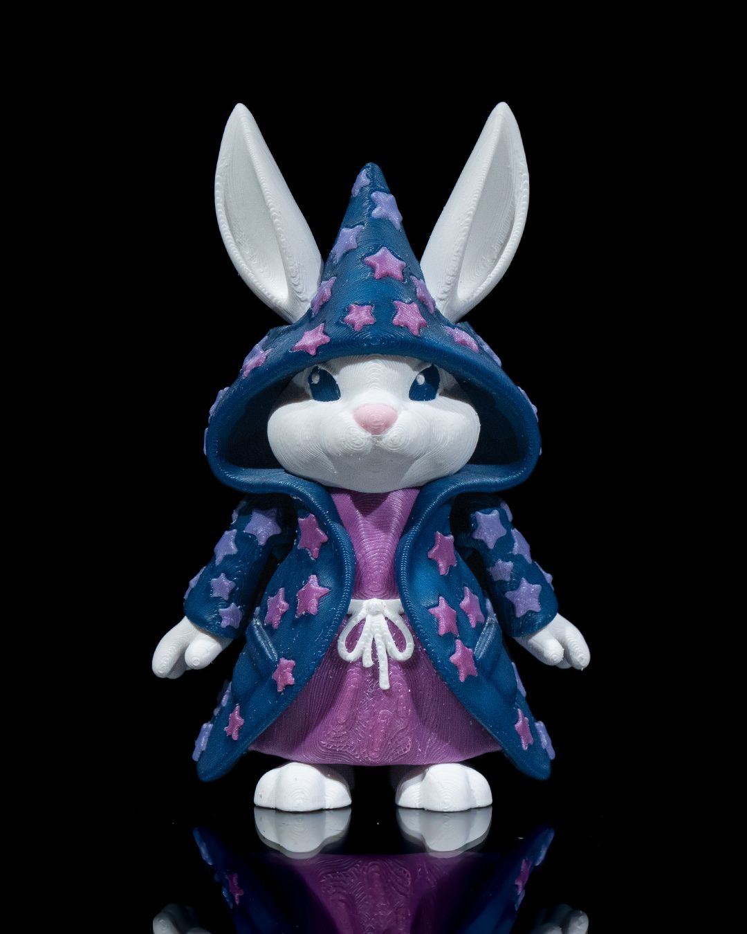 Whimsical Design: Dressed in a deep blue cloak adorned with pastel stars and a magical hood to match.