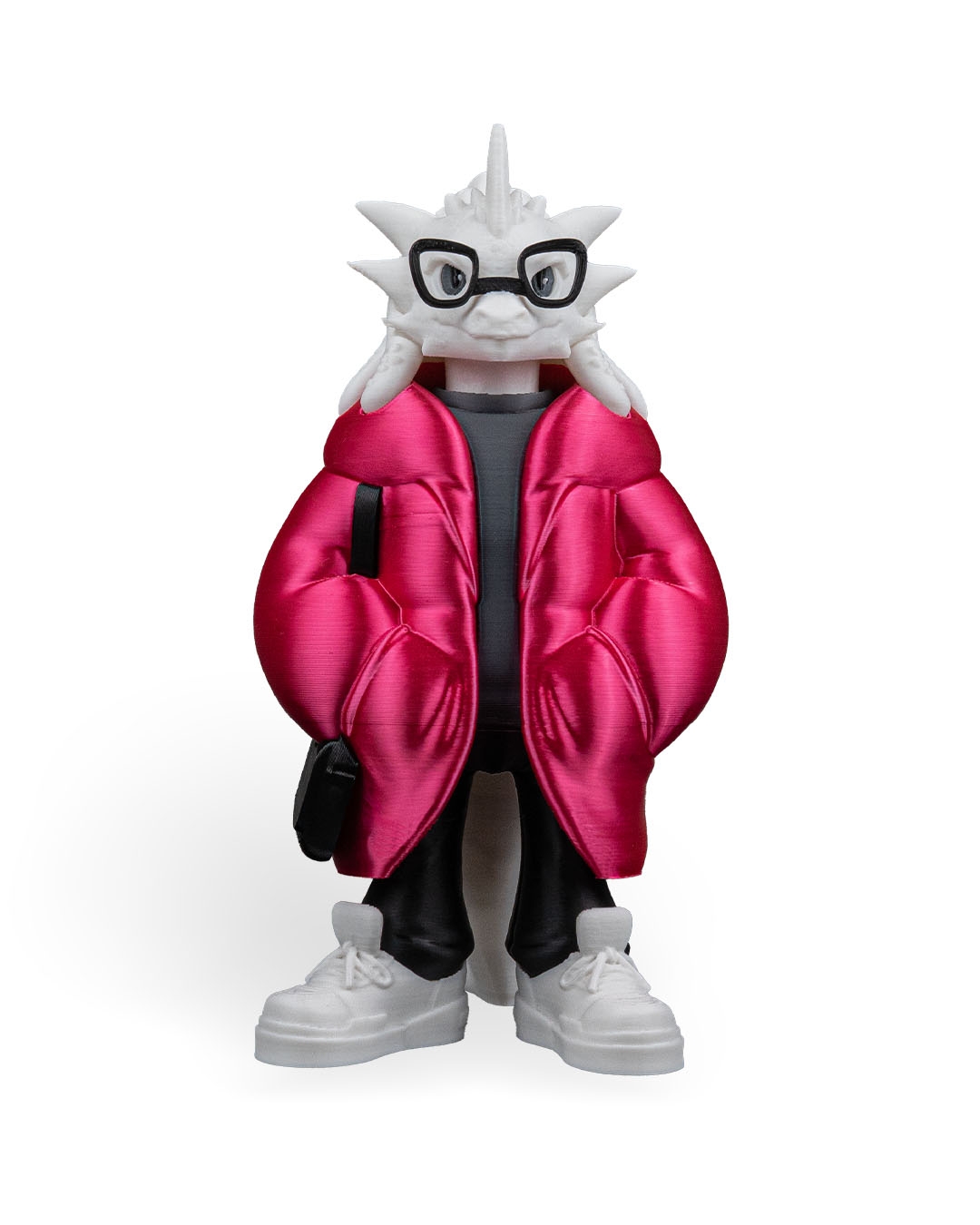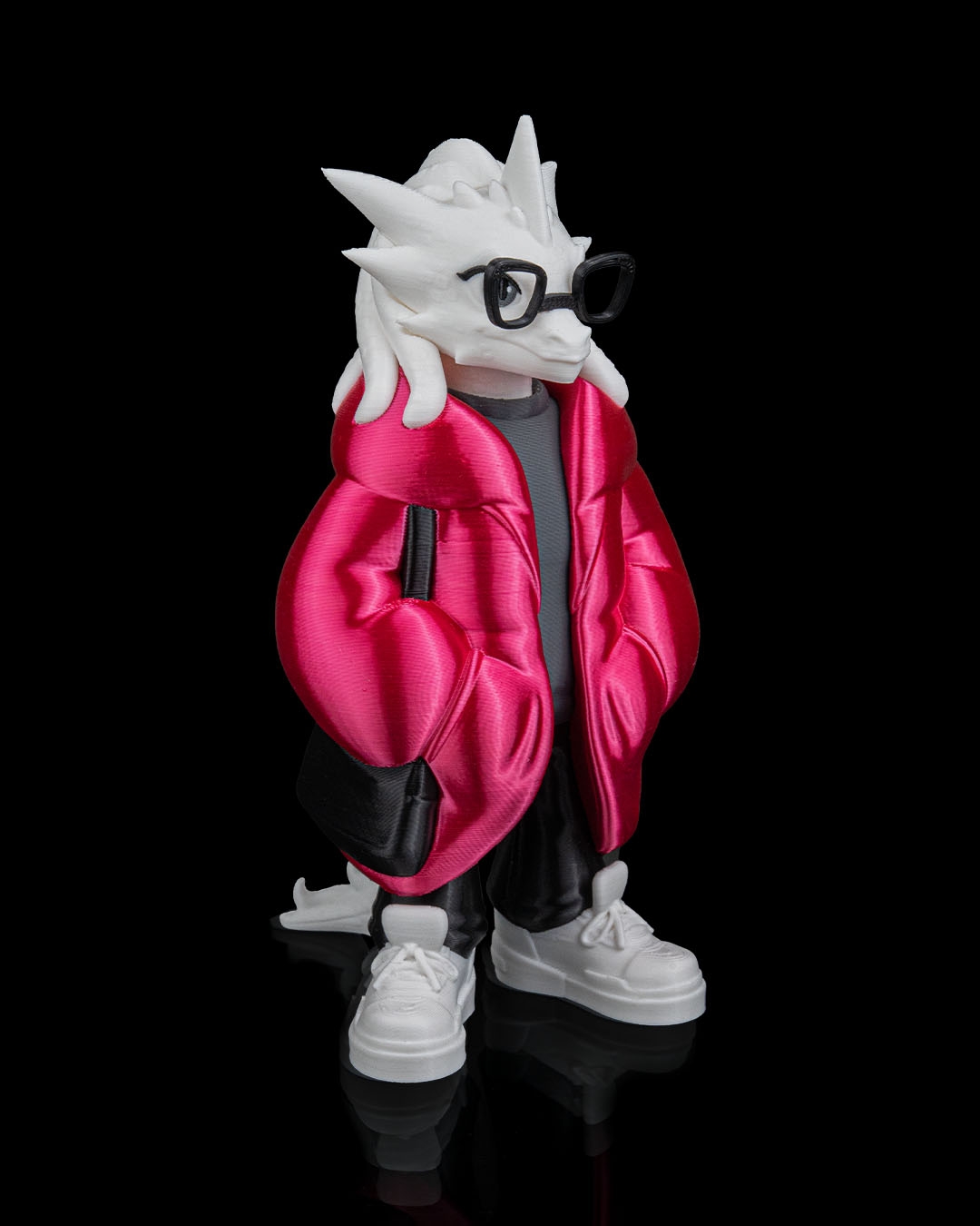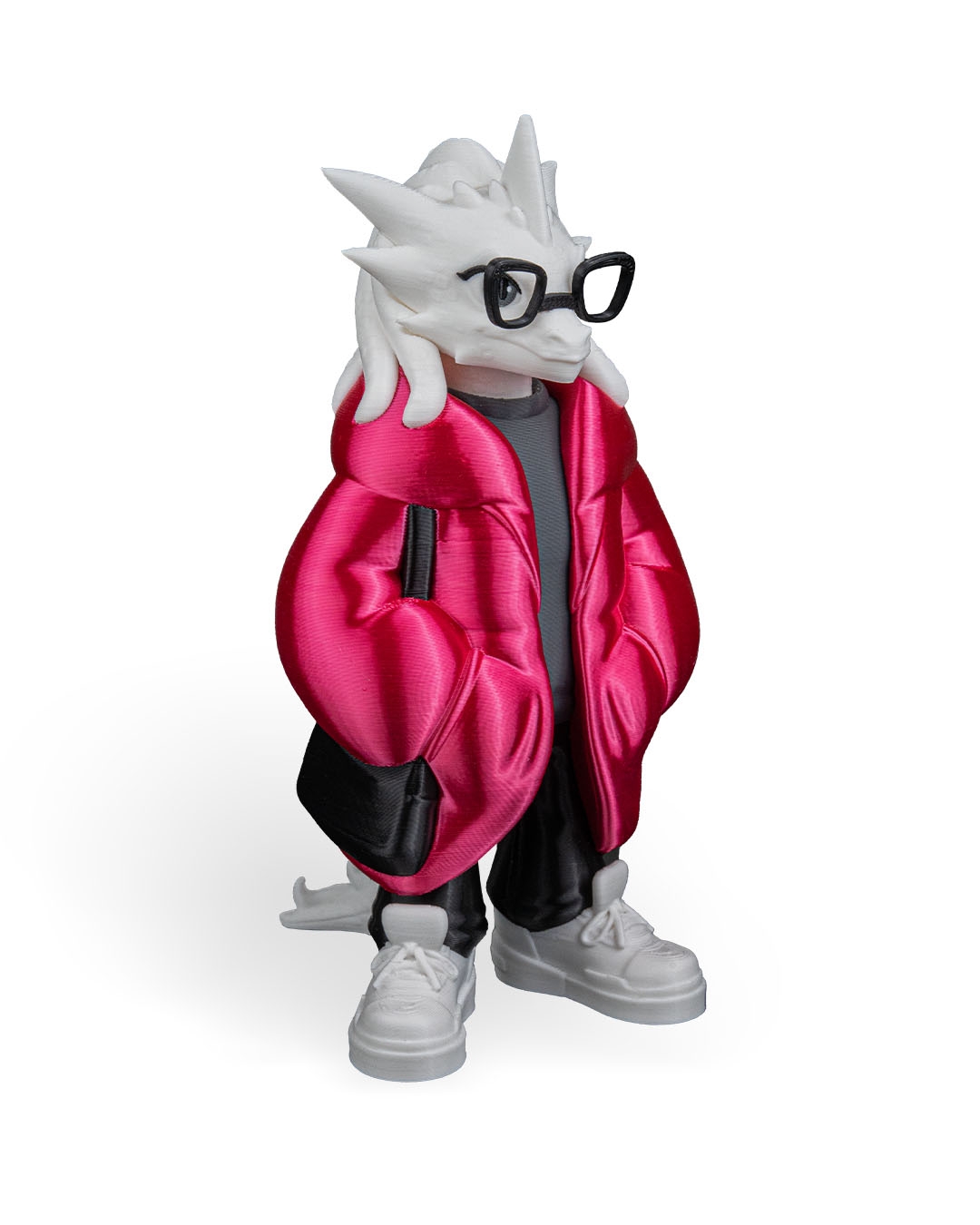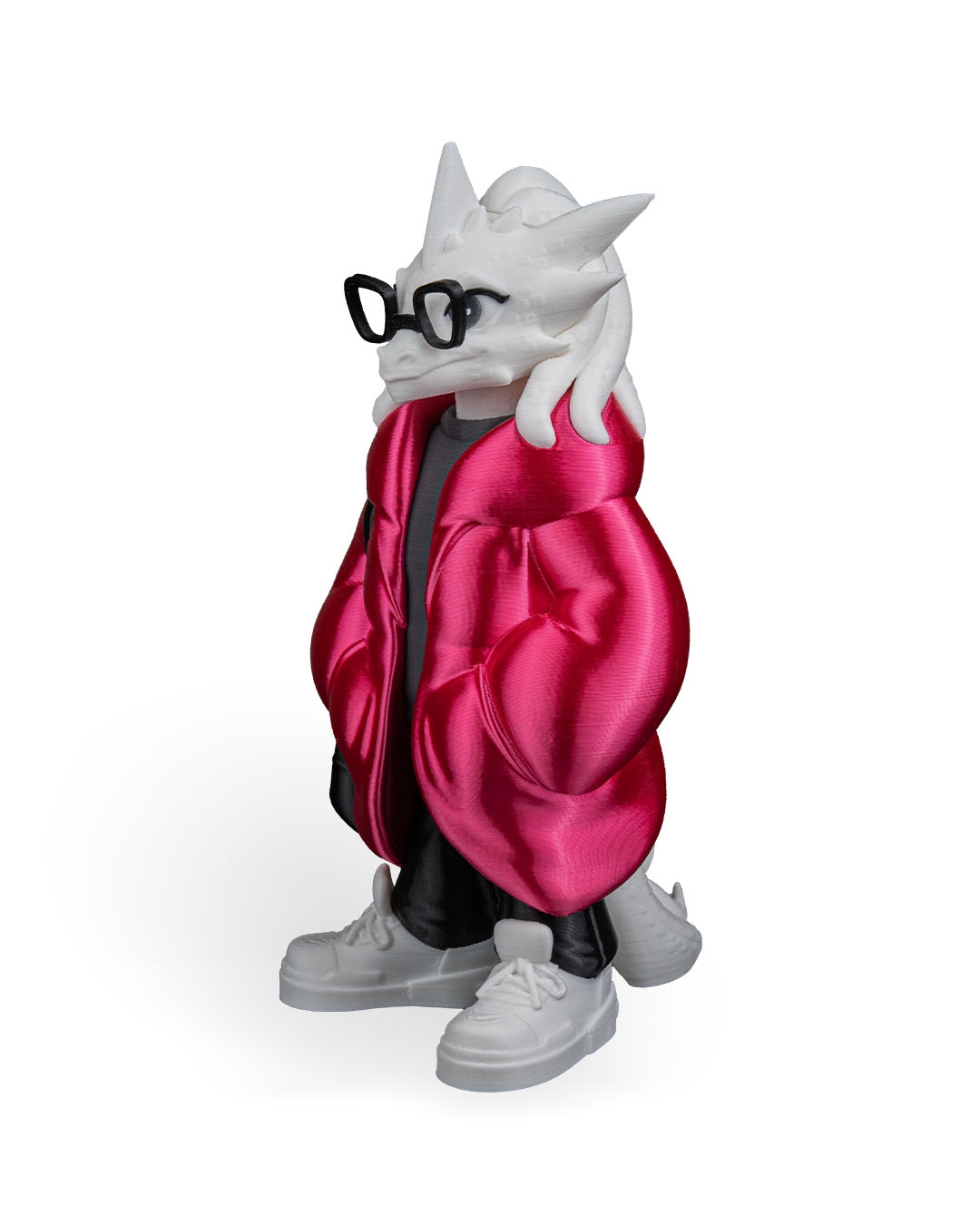 Wearing a bright red puffer jacket over a dark shirt, paired with black pants and white sneakers, this dragon feels urban and current. The sculpted jacket folds and pockets add depth and realism, while the glasses give the character extra personality and charm.