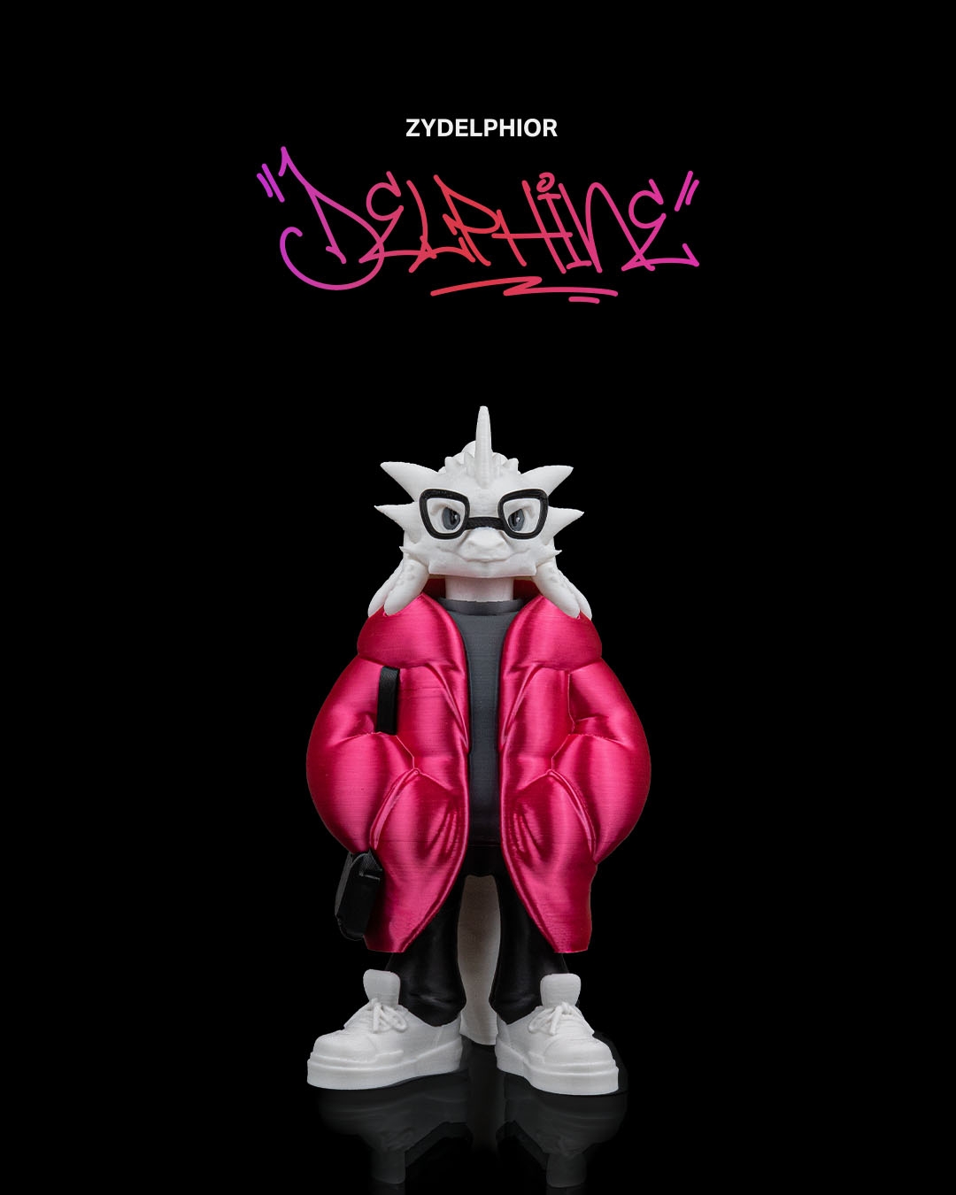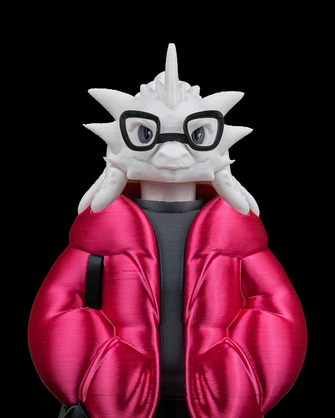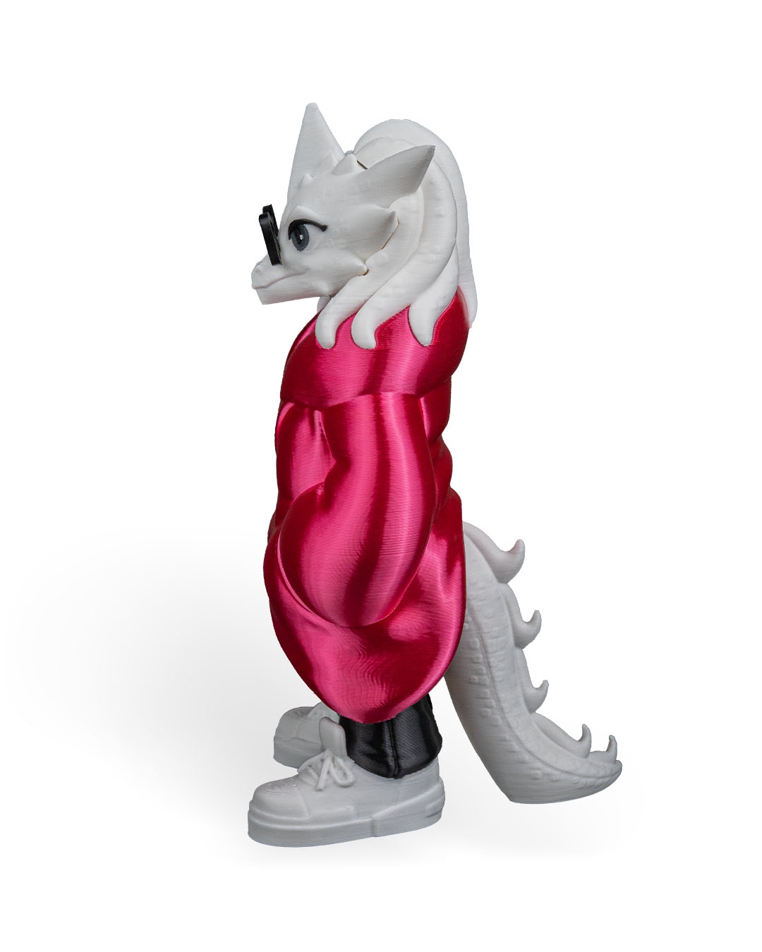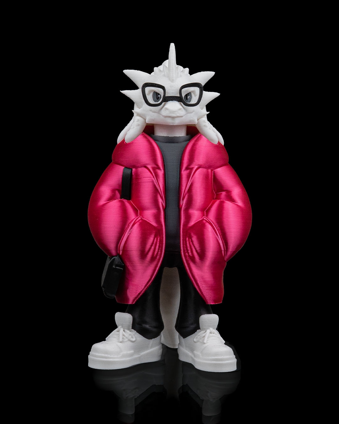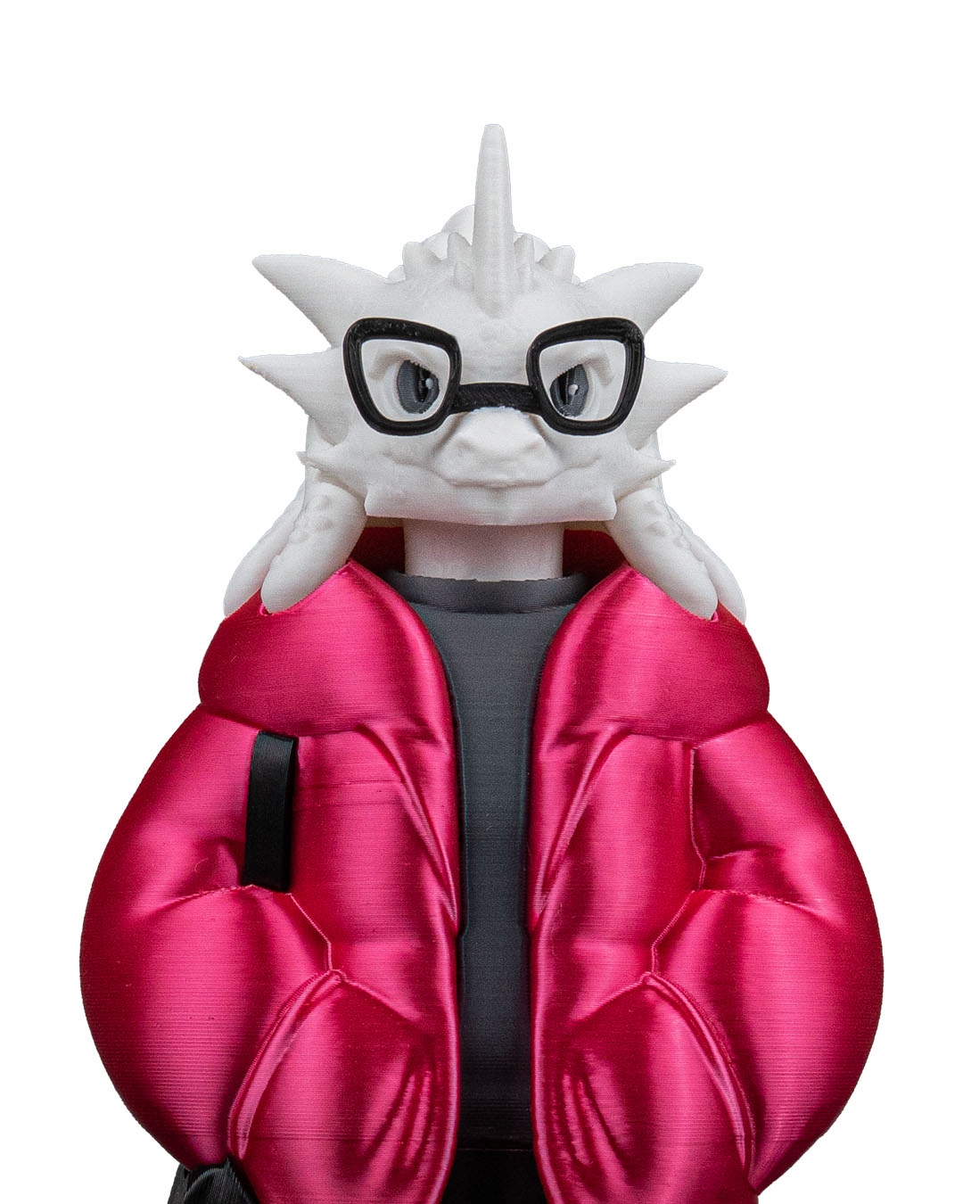 Wearing a bright red puffer jacket over a dark shirt, paired with black pants and white sneakers, this dragon feels urban and current. The sculpted jacket folds and pockets add depth and realism, while the glasses give the character extra personality and charm.